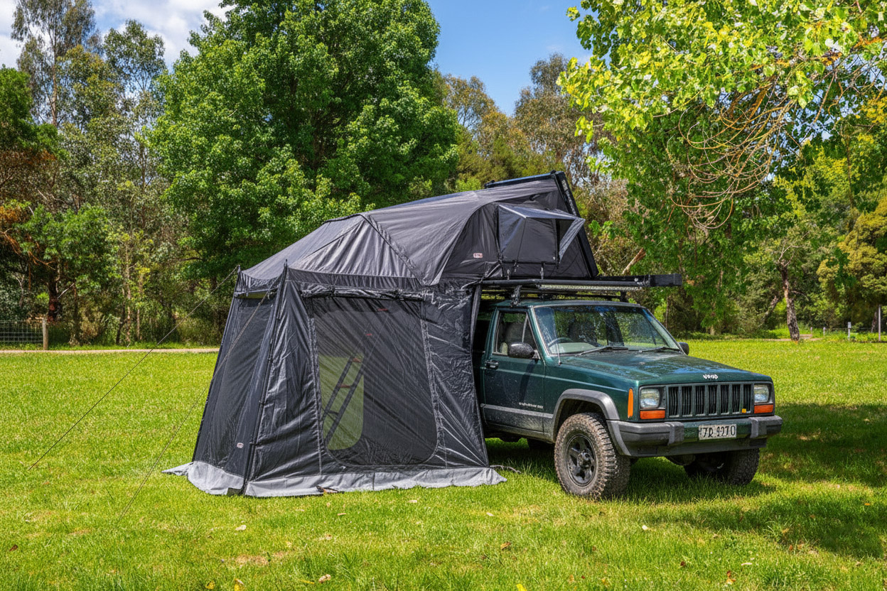 - All black extrusions including ladder, brackets, edges, mount rails, and window rods elevate the look and feel of the Esperance Roof Top Tent