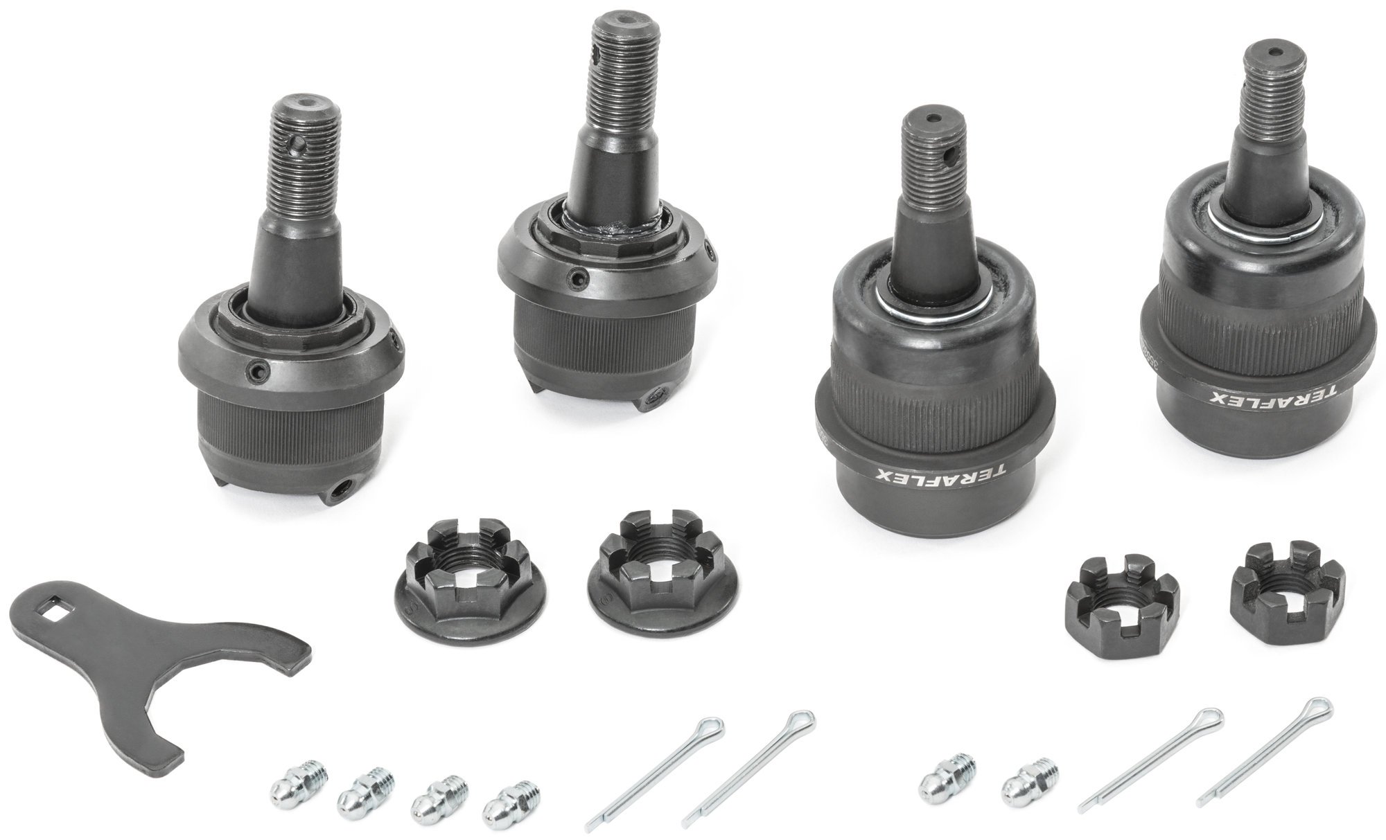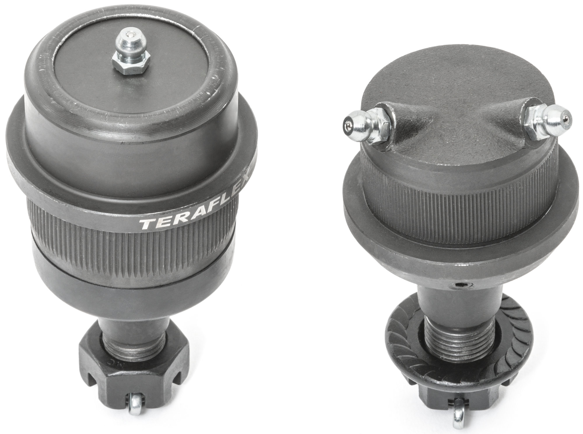 TeraFlex Heavy Duty ball joints are engineered to handle the increased load caused by oversized tires and offset wheels. The upper ball joint incorporates hard sintered wear bushings to handle extreme side load demands with out failure and includes an easy top access grease port for simple maintenance. The lower ball joint features adjustable preload using the included tool when assembled as well as future adjustments. The advanced grease system allows grease servicing to be performed without axle shaft removal. Dual machined grease passages in the lower joint housing assembly provides lubrication access without affecting the ball joint load surface. The lower ball joint also eliminates the nylon ball socket wear sleeve that is prone to failure.